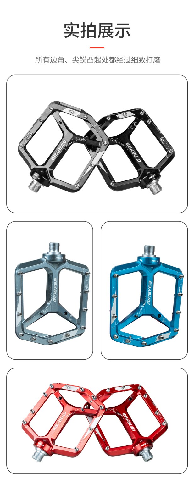 產品描述:景曄新款C6系列外觀設計比較個性化,造型設計相同,采用嵌套軸心的一個設計,所有邊角尖銳凸起除都經過細致打磨,鋁合金CNC本體,珞鉬鋼軸心,騎行更省力,采用大軸承+襯套的一個設計,尺寸分大中小,大號用于速降,中號用于CX,林道,泵道,小號用于童車