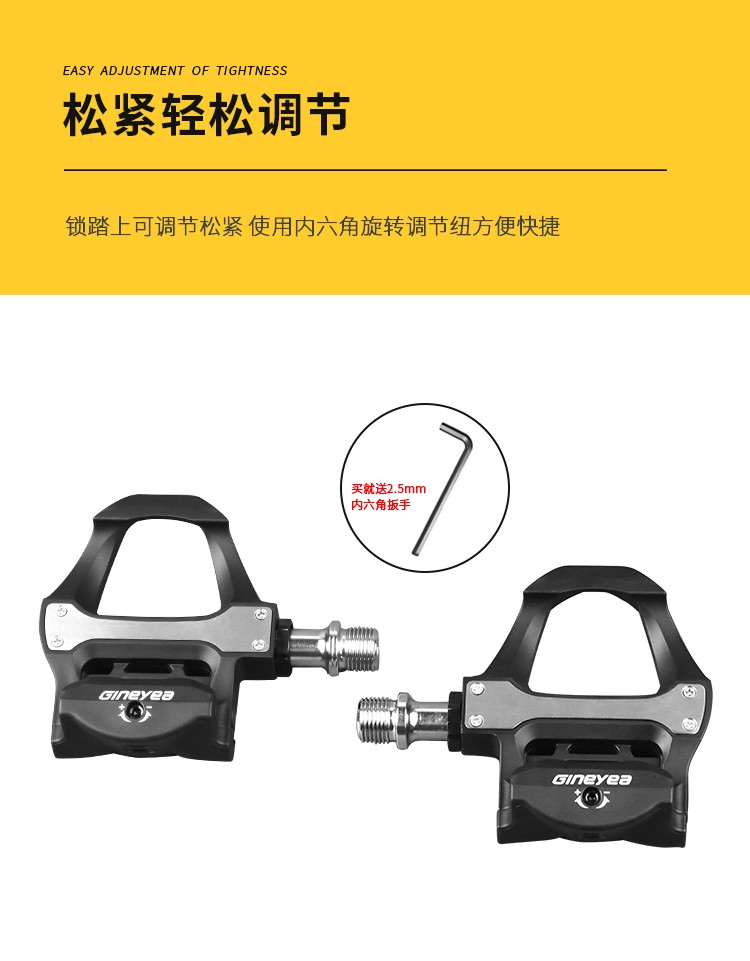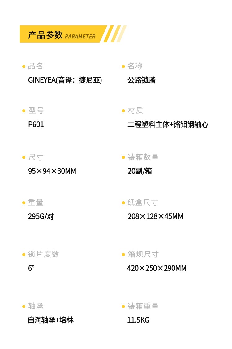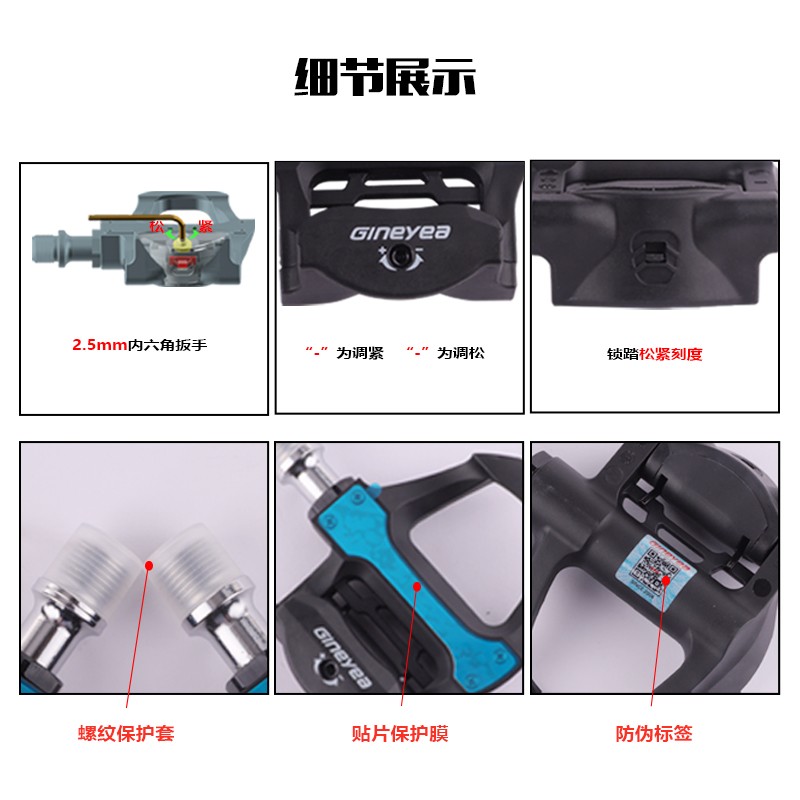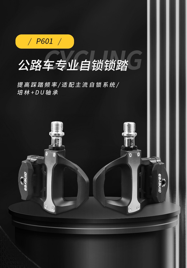 產品描述:請注意,本店標價都是不包括稅點,開票另加稅點,詳細請咨詢客服!!!品牌:GINEYEA(捷尼亞) 型號:P601 品號:13010014 品名:公路車鎖踏PRO(附鎖片6°)黑色執行標準:ISO4210 工藝:本體及扣片注塑成型材質:本體及扣片為工程塑料 軸心為鉻鉬鋼 顏色: 黑色/紅色/淺藍/橙色#公路車專業自鎖鎖踏,適用SPD-SL系統,自帶鎖片體驗不一樣的騎行速度、穩定、省力,踏板流線型一體化設計,高強度質量輕的尼龍材料...